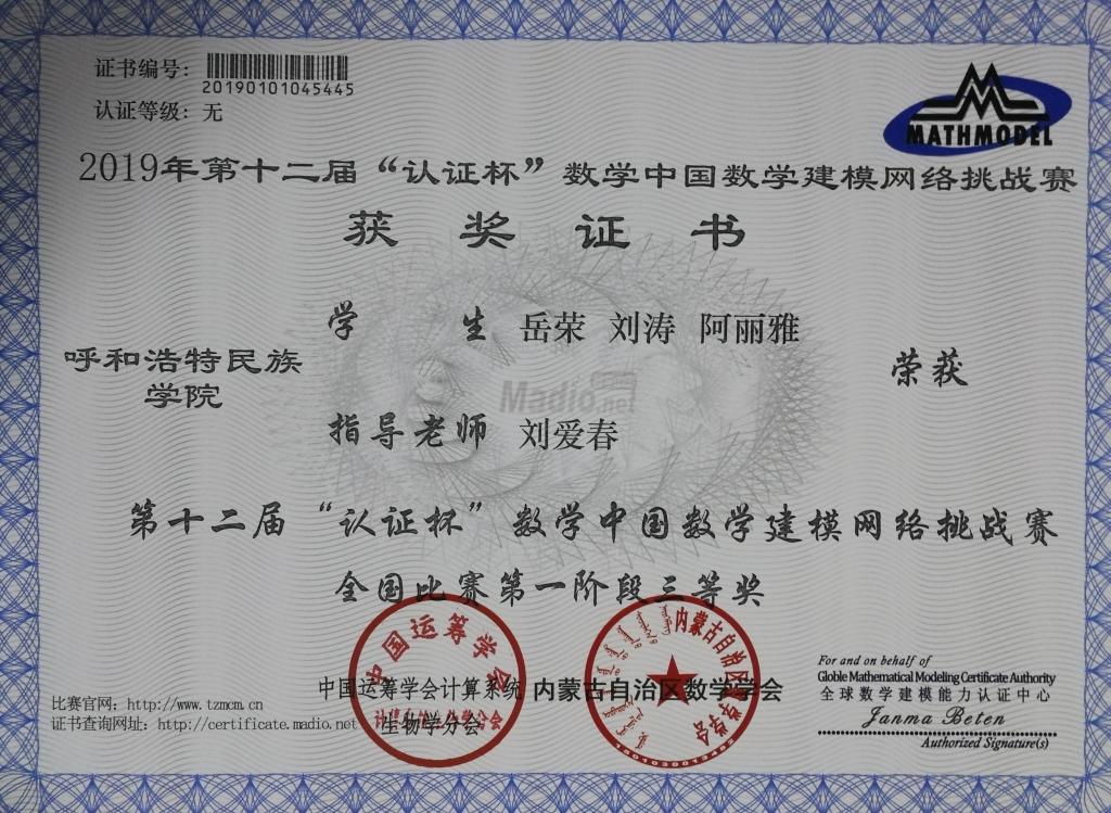 beat365官网数学与大数据学院参赛队在2019年“认证杯”数学中国数学建模网络挑战赛先后于4月份和5月份两阶段分别为3972,1638支参赛队中竞赛取得2个二等奖,5个三等奖以及3个优秀奖的好成绩。“认证杯”数学中国数学建模网络挑战赛是由内蒙古自治区数学学会主办面向全国的比赛,由刘爱春、高晶英和青梅三位博士担任指导教师。