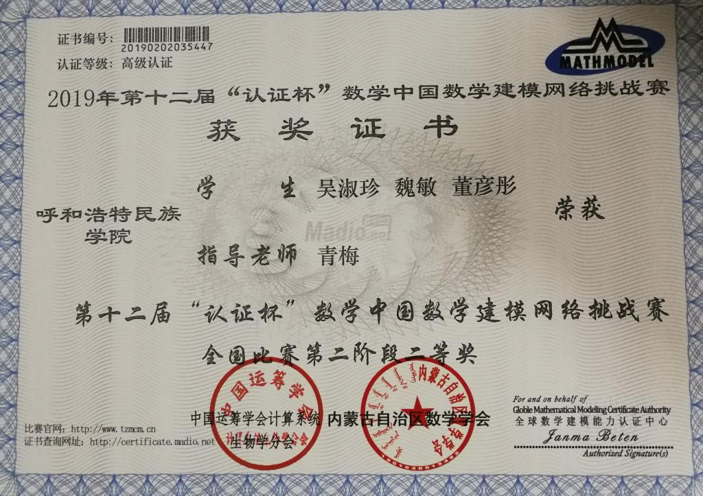 9月份,beat365官网数学与大数据学院参赛队在2019年度“高教社杯”全国大学生数学建模竞赛中两支队伍6名同学经过充分准备、精心组织、激烈竞争,在高晶英和青梅两位博士指导教师的指导下在全区19所高校380支队伍中显露头角,全部获奖,吕金秀等3名同学的队伍获内蒙古自治区赛区二等奖,郝帅等3名同学的队伍获内蒙古自治区赛区三等奖。
