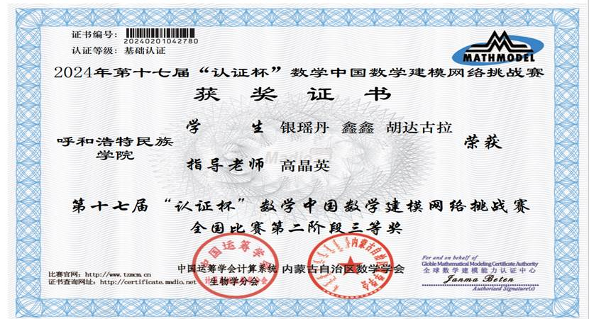 2024年,学院重视和加强学生参加数学建模及各类学科竞赛活动,安排黄大年式教师团队骨干教师精心组织学生参赛,悉心指导培训。组织20支学生队参加2024年第十七届“认证杯”数学中国数学建模网络挑战赛,共有18支队伍获奖,其中1支队伍荣获二等奖,2支队伍荣获三等奖。数学与大数据学院荣获2024年第十七届“认证杯”数学中国数学建模网络挑战赛“优秀组织单位”荣誉称号。