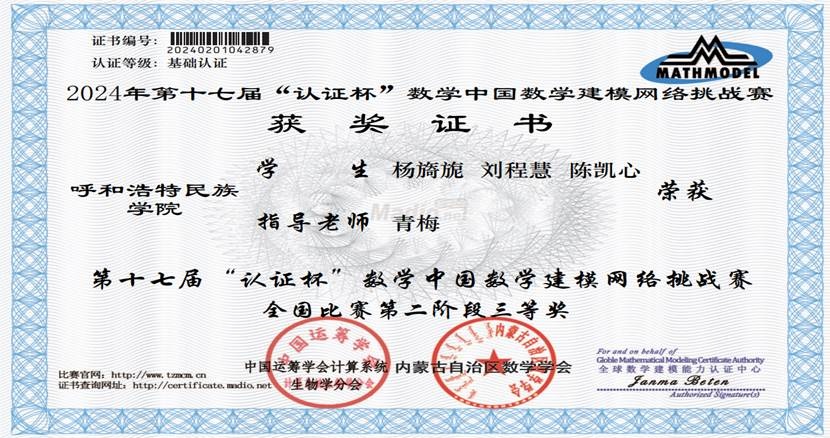 “认证杯”数学中国数学建模网络挑战赛是面向全国各高校大学生开展的一项赛事,也是全国大学生五大类竞赛之一的“高教社杯”全国大学生数学建模竞赛赛前的训练机会。通过组织学生参加此项比赛,激发了学生的学习数学、软件等知识和对现实问题深入探究的兴趣,促进了学生学以致用,有效助力力提升和发挥学生沟通协作、文献查阅、写作等综合能力。