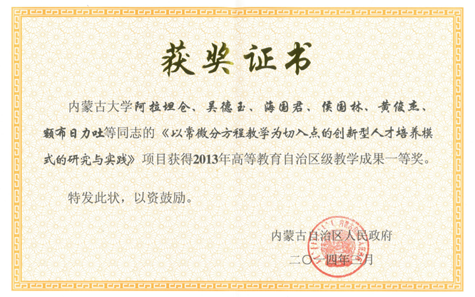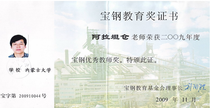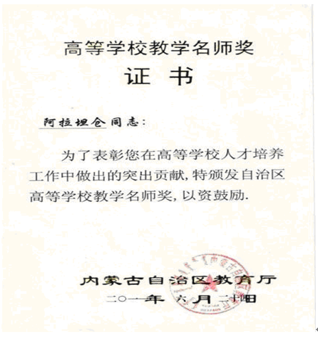 阿拉坦仓教授获奖证书扫描图