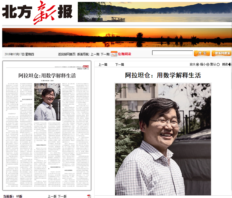 2018年5月17日,《北方新报》刊发题为《阿拉坦仓:用数学解释生活》的整版报道。该文讲述了阿拉坦仓副院长在霍金身边的求学经历,介绍了他作为全国政协委员和黄大年式教师团队带头人,对发展民族教育和数学研究事业所做出的努力,赞誉了阿副院长心怀感恩、回报家乡之情。(转自校园网)