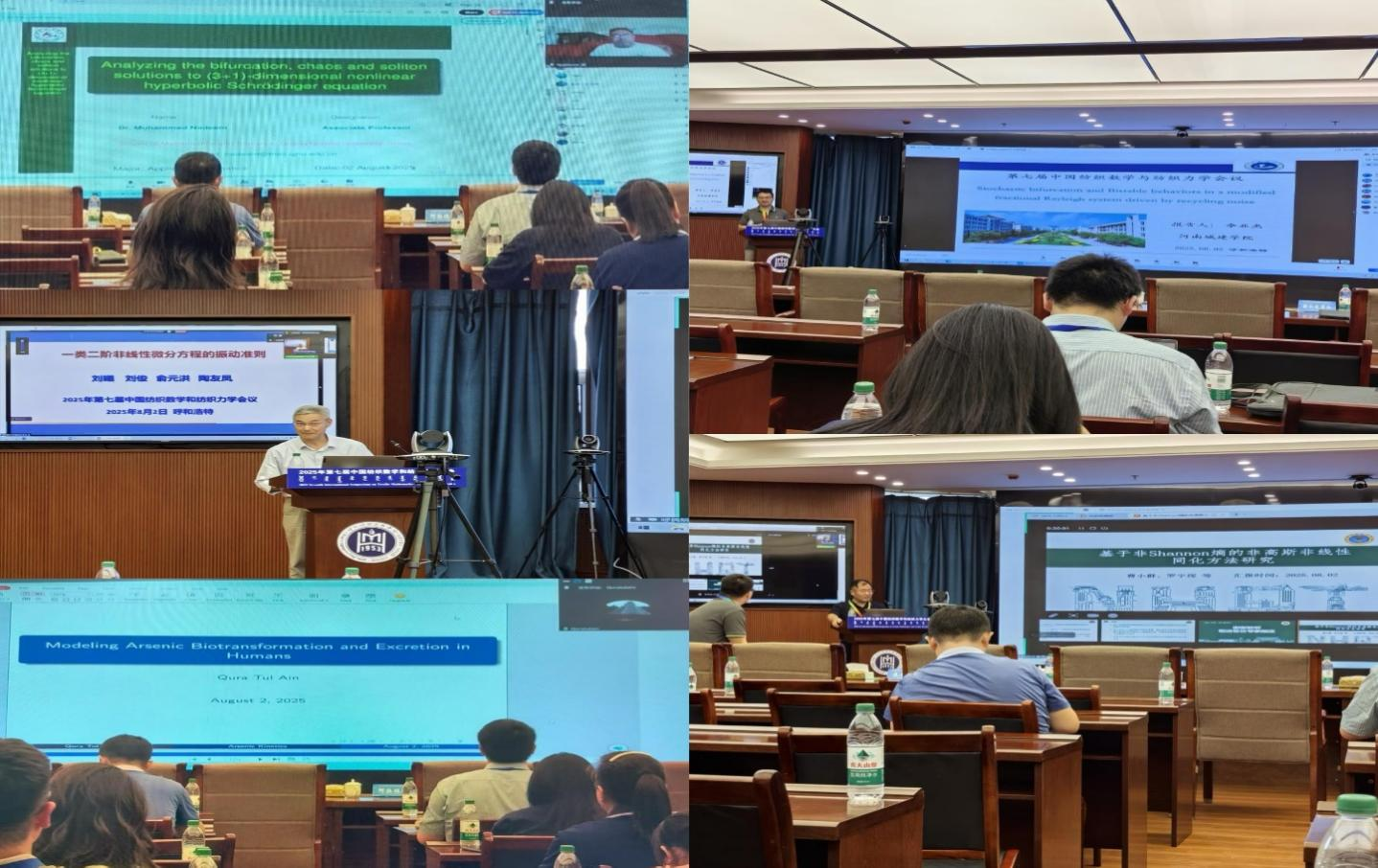 邀请报告环节,曲靖师范大学助理教授Muhammad Nadeem、河南城建学院李亚杰副教授、曲靖师范学院刘俊教授、广州大学博士后 Q.T.Ain、国防科技大学曹小群教授分别以“Analyzing the bifurcation, chaos and soliton solutions to (3+1)-dimensional nonlinear hyperbolic Schrödinger equation”“Stochastic bifurcation and bistable behaviors in a modified fractional Rayleigh system driven by recycling noise ”“Oscillation criteria of a class of second order nonlinear differential equations”“Modeling Arsenic Biotransformation and Excretion in Humans”“基于非Shannon 熵的非高斯非线性同化方法研究”为题作报告。