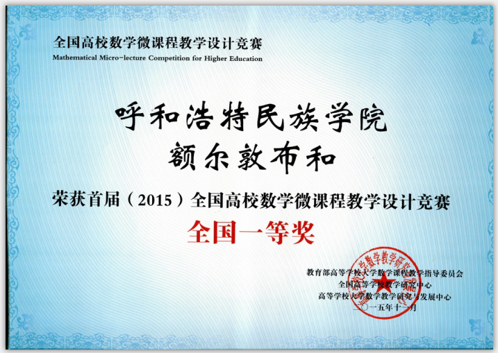15. 教学成果:首届(2015)全国高校数学微课程教学设计竞赛全国一等奖证书(获奖者:额尔敦布和)