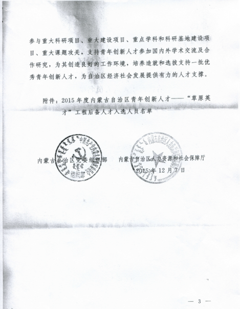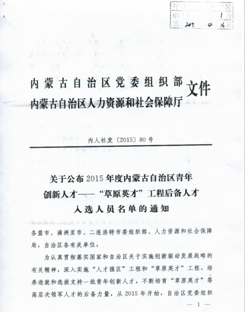 11. 人才工程:关于公布2015年度内蒙古自治区青年创新人才——“草原英才”工程后备人才入选人员名单的通知(获得者:额尔敦布和)