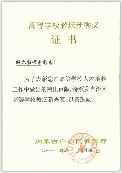 7. 质量工程:2011年内蒙古自治区高等学校“教坛新秀”证书(获得者:额尔敦布和)
