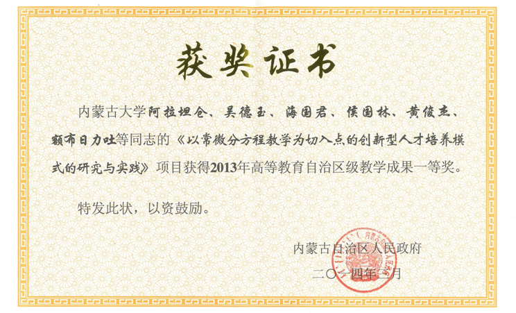 2.教学成果:2013年高等教育内蒙古自治区成果奖证书——“以常微分方程教学为切入点的创新型人才培养模式的研究与实践”(一等奖)(负责人:阿拉坦仓)