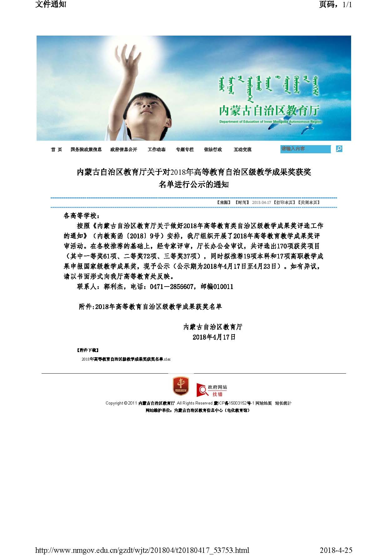 1. 教学成果:内蒙古自治区教育厅关于对2018年高等教育自治区级教学成果奖名单进行公布的通知(一等奖)(负责人:额尔敦布和)