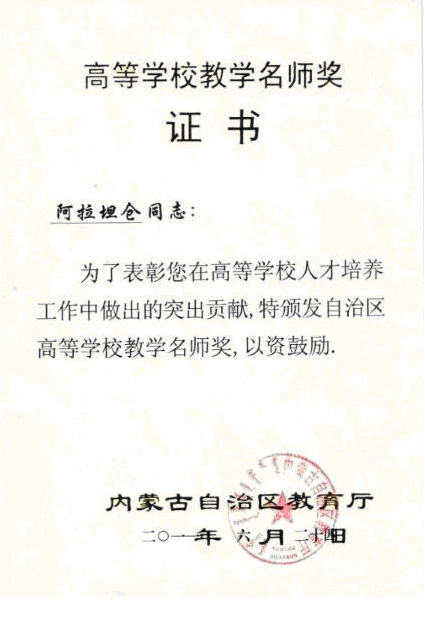 2. 2013年,阿拉坦仓主讲的《行星运动与常微分方程》课入选国家级精品视频公开课,在爱课程网、网易公开课上推广。应高等教育出版社和北京高校数学教育发展研究中心的邀请,阿拉坦仓在“2016年北京高校数学教师暑期培训暨第二届华北赛区微课比赛颁奖会”等上作报告,赢得广泛赞誉。