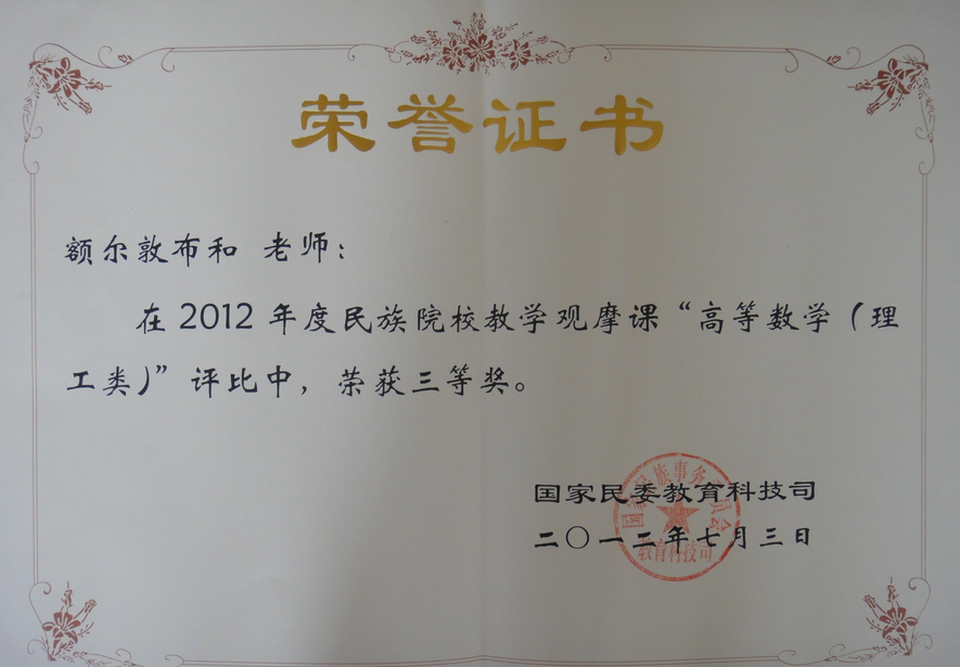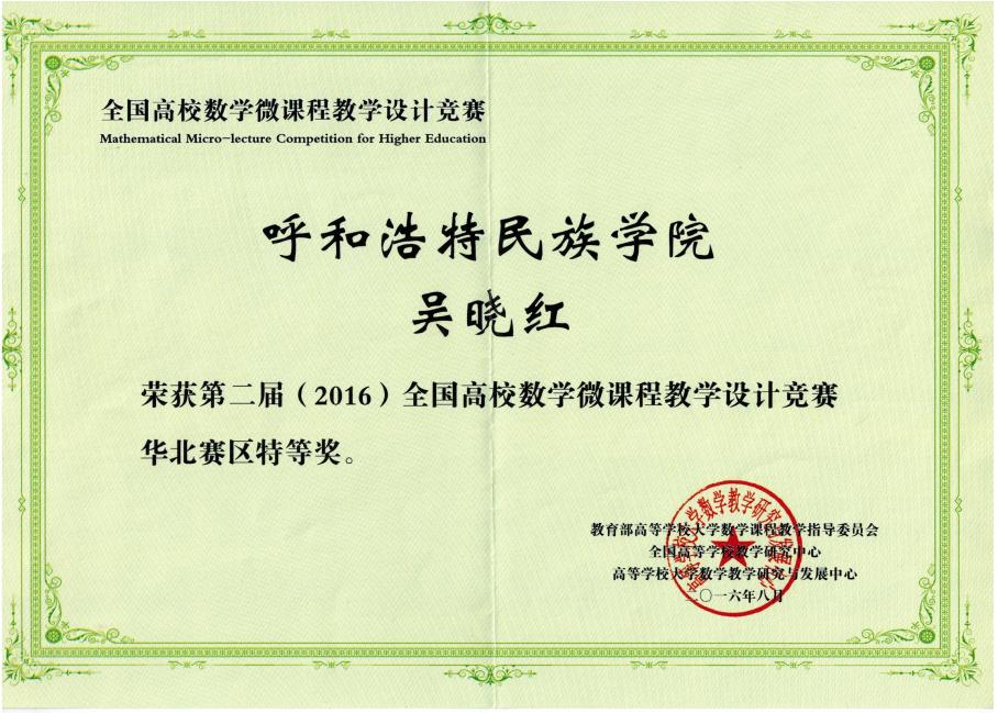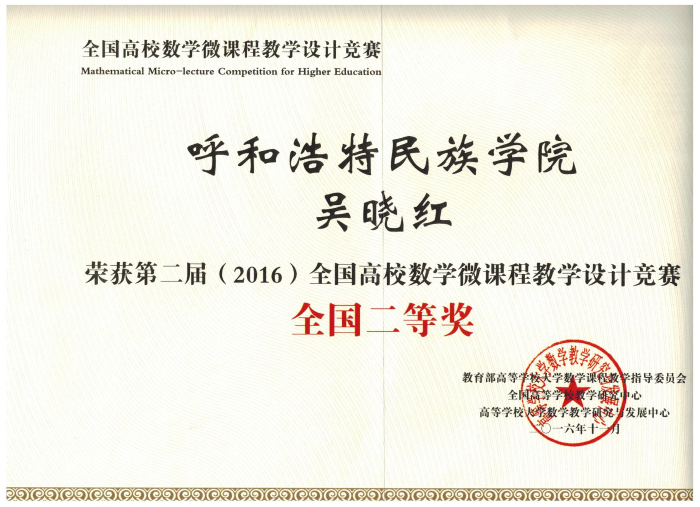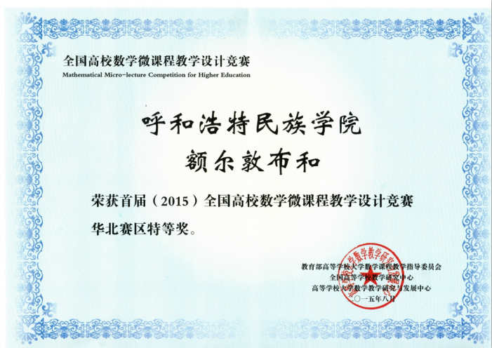 3. 多次获全国高校数学微课教学设计竞赛一、二等奖及华北赛区特等奖。额尔敦布和的“第一型曲面积分的计算法”微课在爱课程网上推广,并在“2015年北京高校数学教师暑期培训会”、“全国少数民族数学教育研讨会”上展示,取得良好效果。