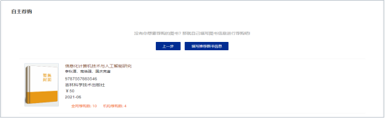4.对于平台上没有的图书,读者可以进行自主荐购,点击页面右侧“自主荐购”按钮,即可进行自主荐购。