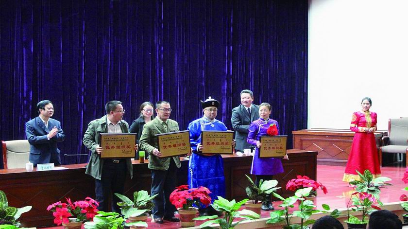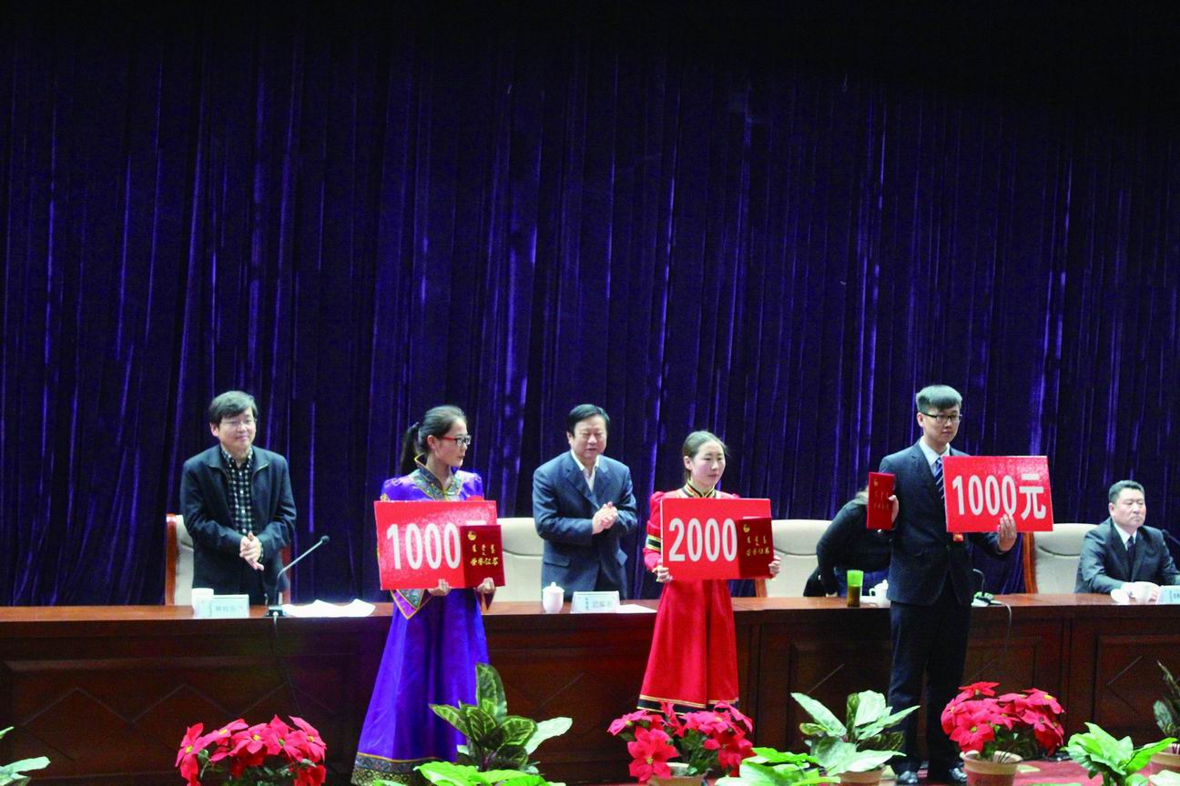 会上,学院领导为获得奖励的集体和个人颁发了荣誉证书和奖金。获得“第八届‘挑战杯’全区大学生课外学术科技竞赛金奖作品优秀指导教师”的蒙古语言文学系教师佟金荣和获得“全区第八届‘浪潮杯’大学生程序设计大赛本科组一等奖”、“东北地区第七届大学生程序设计大赛暨2013年中俄对抗赛三等奖”的计算机系学生王春磊分别代表获奖师生发言。