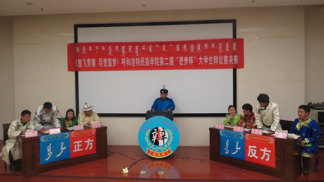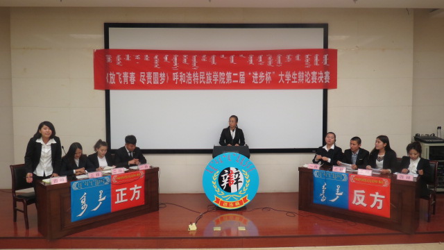 5月12日晚7:00,由学院团委主办、学生联合会承办的第二届“进步杯”大学生辩论赛在图书馆一楼报告厅圆满落下帷幕,此次辩论赛以“放飞青春 尽责圆梦”为主题。学院机关党总支书记哈申图雅教授、团委副书记海霞、学生处副处长朝克吉勒图、蒙古语言文学系党总支副书记周双喜、传媒系播音与主持教研室主任乌日更照来应邀担任了决赛评委。