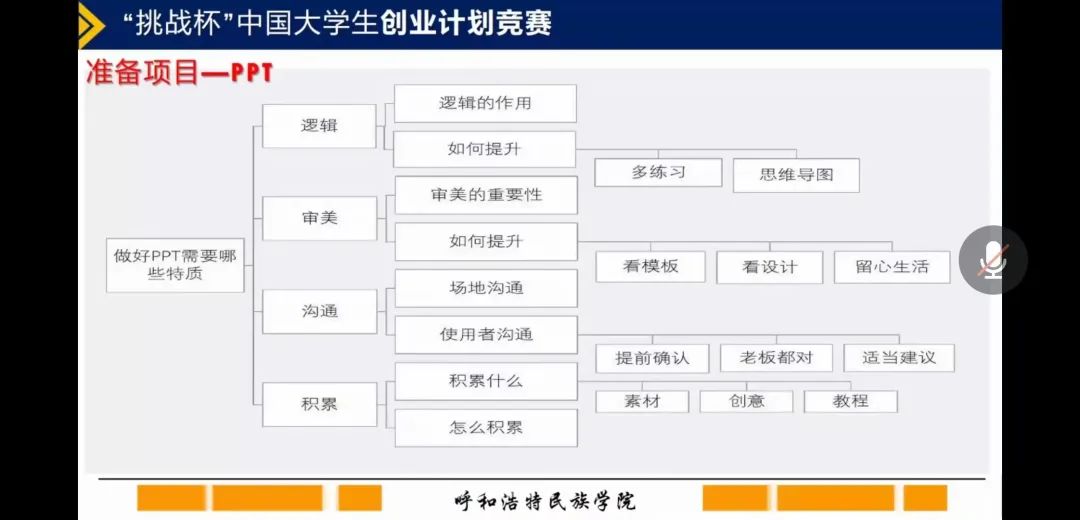 陈玉珍导师从“挑战杯”系列赛事的概述、赛事历程、参赛流程及计划书撰写、现场路演答辩注意事项等四个方面进行了详细的说明与指导。