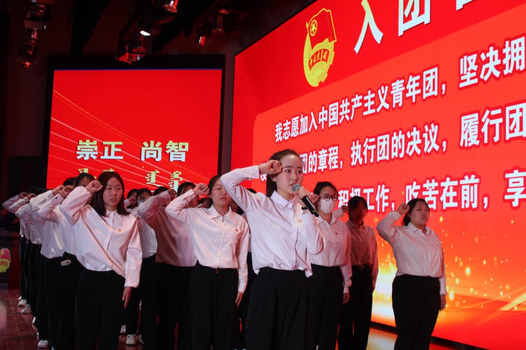 会上,学生工作部部长杨福梅宣读了表彰决定。先进集体代表教师姜鹏、优秀共青团员代表吴丽丽分别在大会上作了交流发言。结束表彰环节之后,进行了新团员入团仪式暨老团员重温入团誓词仪式。入团仪式后,由窦建文、张翎艳等青年学生代表共同朗诵《五四的火炬》,启发与会青年们不忘初心勇担当,牢记使命再起航。