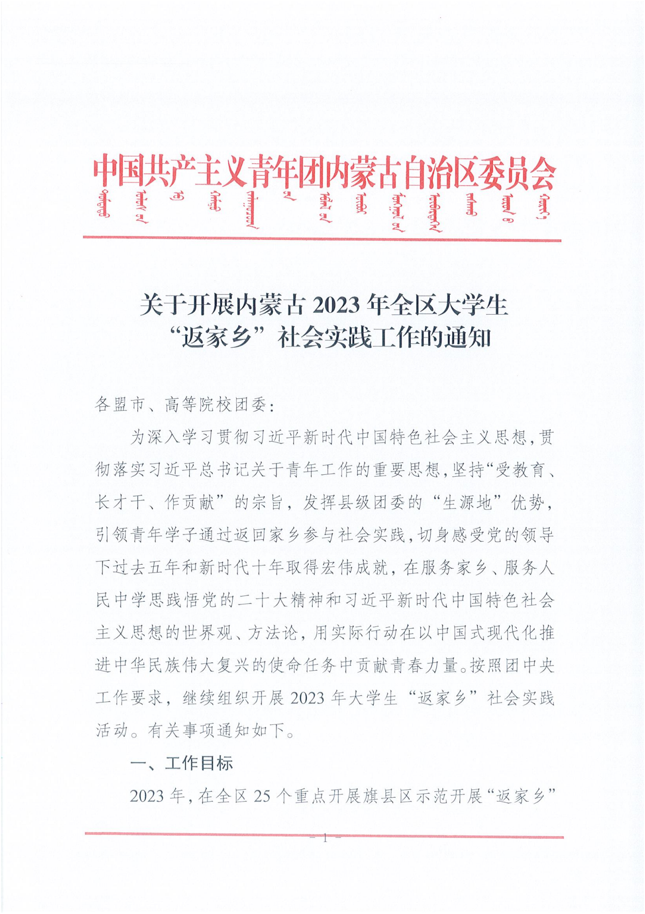 关于开展内蒙古2023年全区大学生“返家乡”社会实践工作的通知