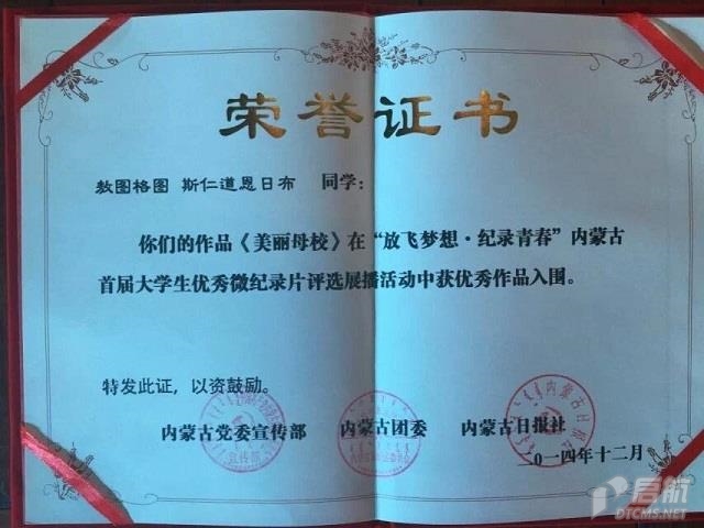 我院传媒系学生斯仁道恩日布、敖图格图同学的微纪录片作品《美丽的母校》获优秀作品入围奖。
