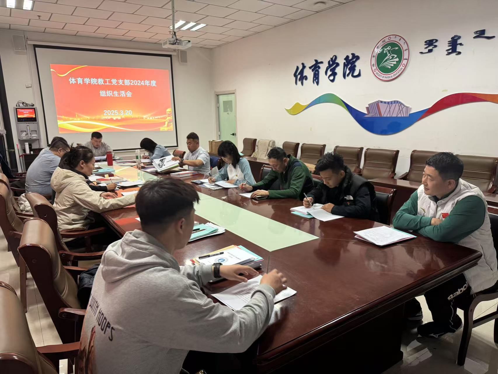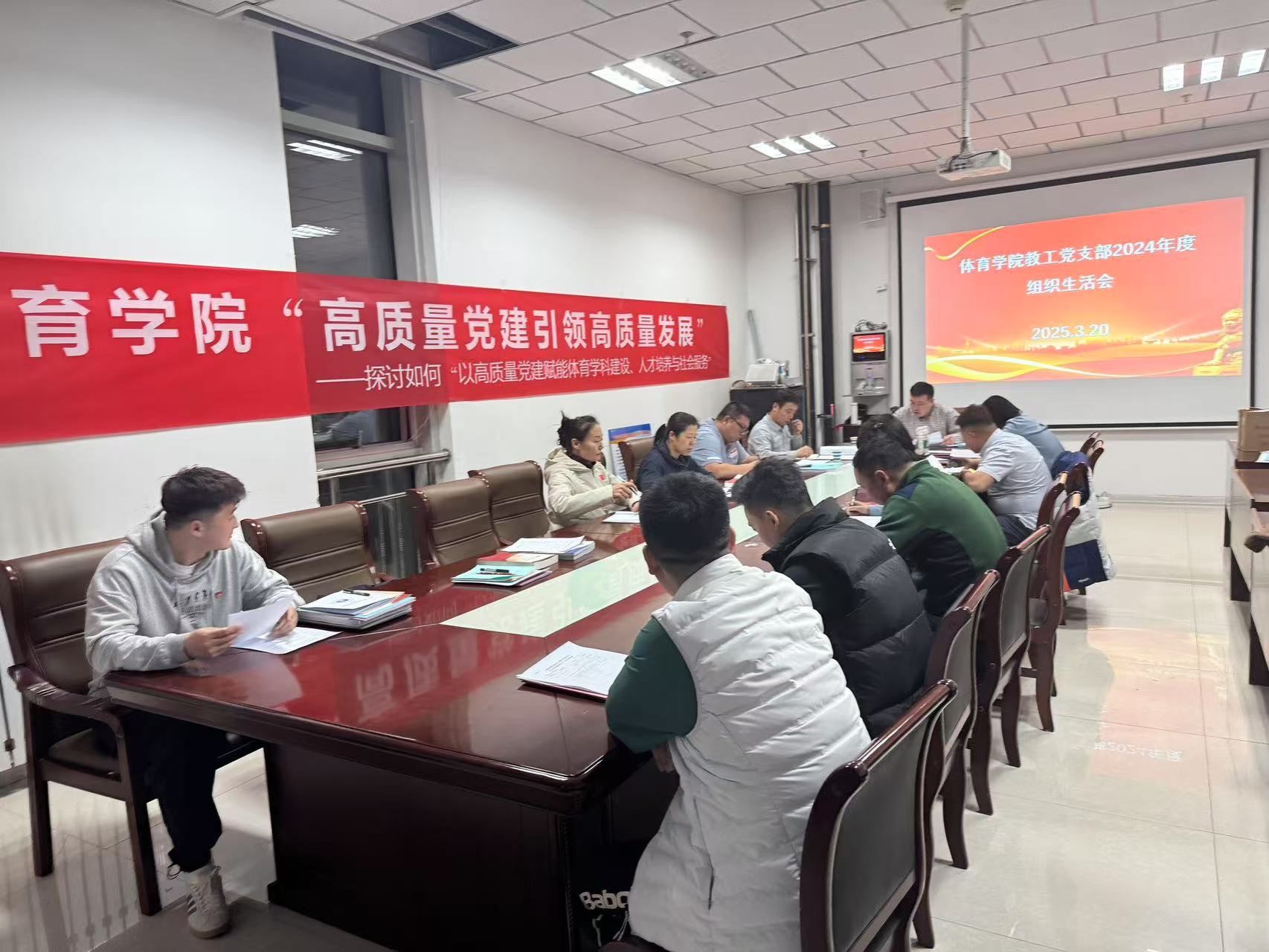 为深入学习贯彻习近平新时代中国特色社会主义思想,加强党员队伍建设,提升党支部的凝聚力和战斗力,3月20日晚19:30,体育学院教工党支部在体育馆三楼会议室召开了2024年度专题组织生活会及党员民主评议会。本次会议由党支部书记包金海同志主持,体育学院全体党员参加。