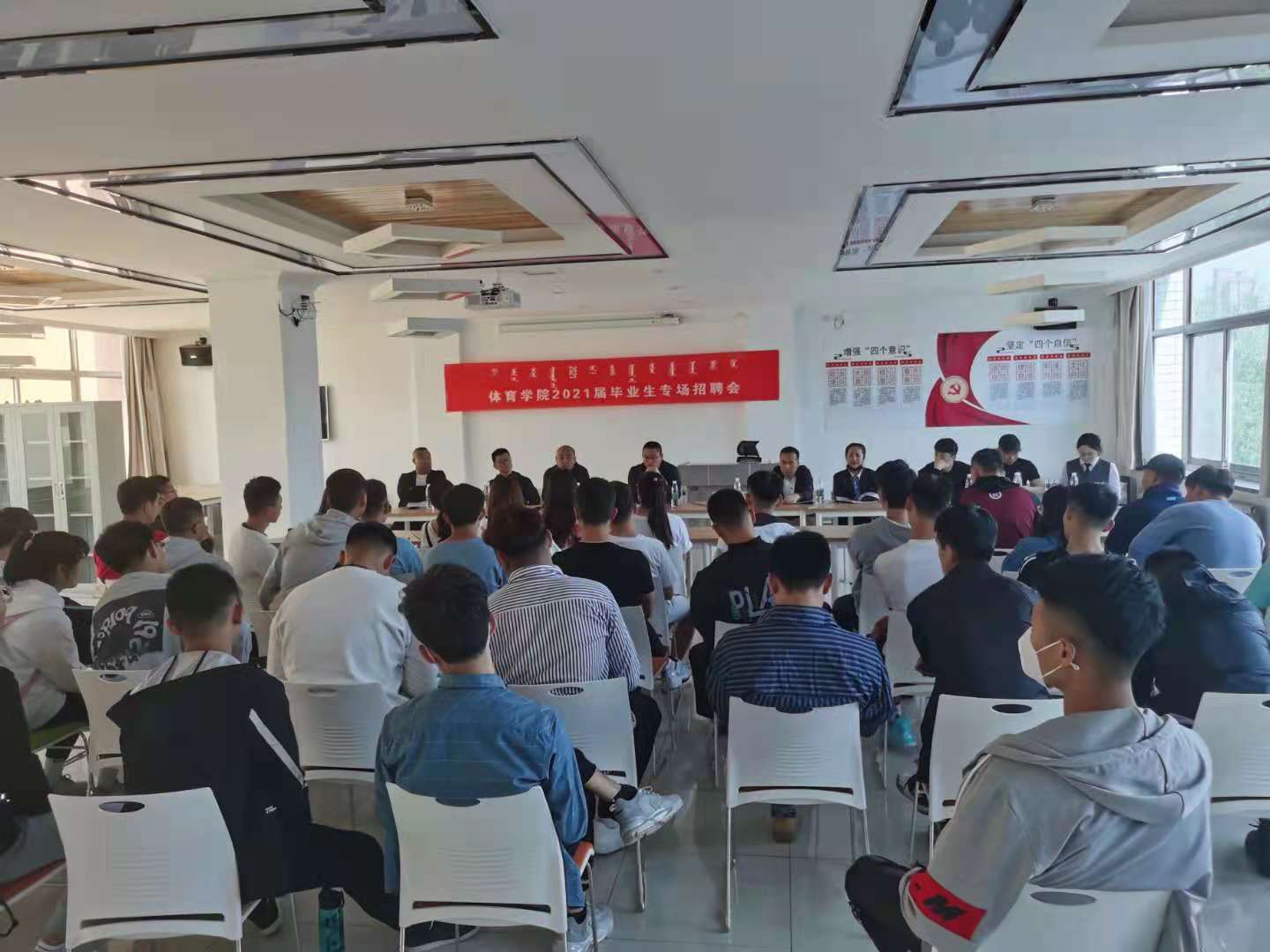 为拓展就业渠道,保证毕业生顺利就业,体育学院于5月25日举办2021届毕业生专场招聘会,共有内蒙古腾和体育发展有限公司、内蒙古苏鲁锭体育产业发展有限公司、内蒙古贝德堡健身等8家体育公司参加,提供教练、课程顾问、器材销售等50余个岗位。