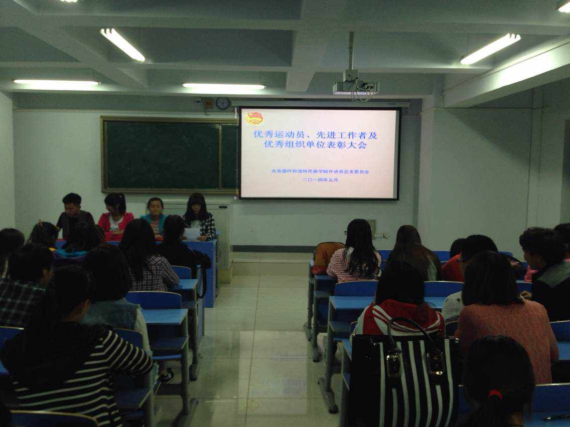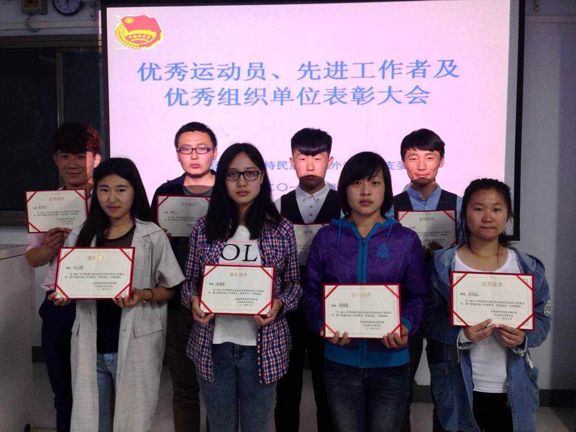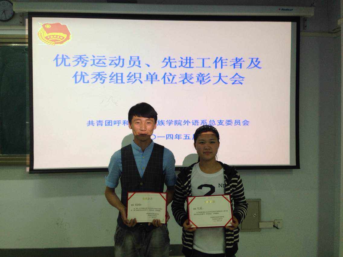 在2014年学院那达幕大会及田径运动会中我系运动员拼搏努力,充分发挥了“友谊第一,比赛第二”的风格和“更好、更快、更强”的体育精神,为鼓励同学们积极参加体育运动,加强锻炼,结合比赛实际,授予查干牧仁等3名同学为系级优秀运动员称号;结合出勤、纪律等情况授予2012日2班等3个班集体为优秀组织单位称号;结合工作服务表现,授予包木其尔等10名同学为运动会工作先进工作者荣誉称号。