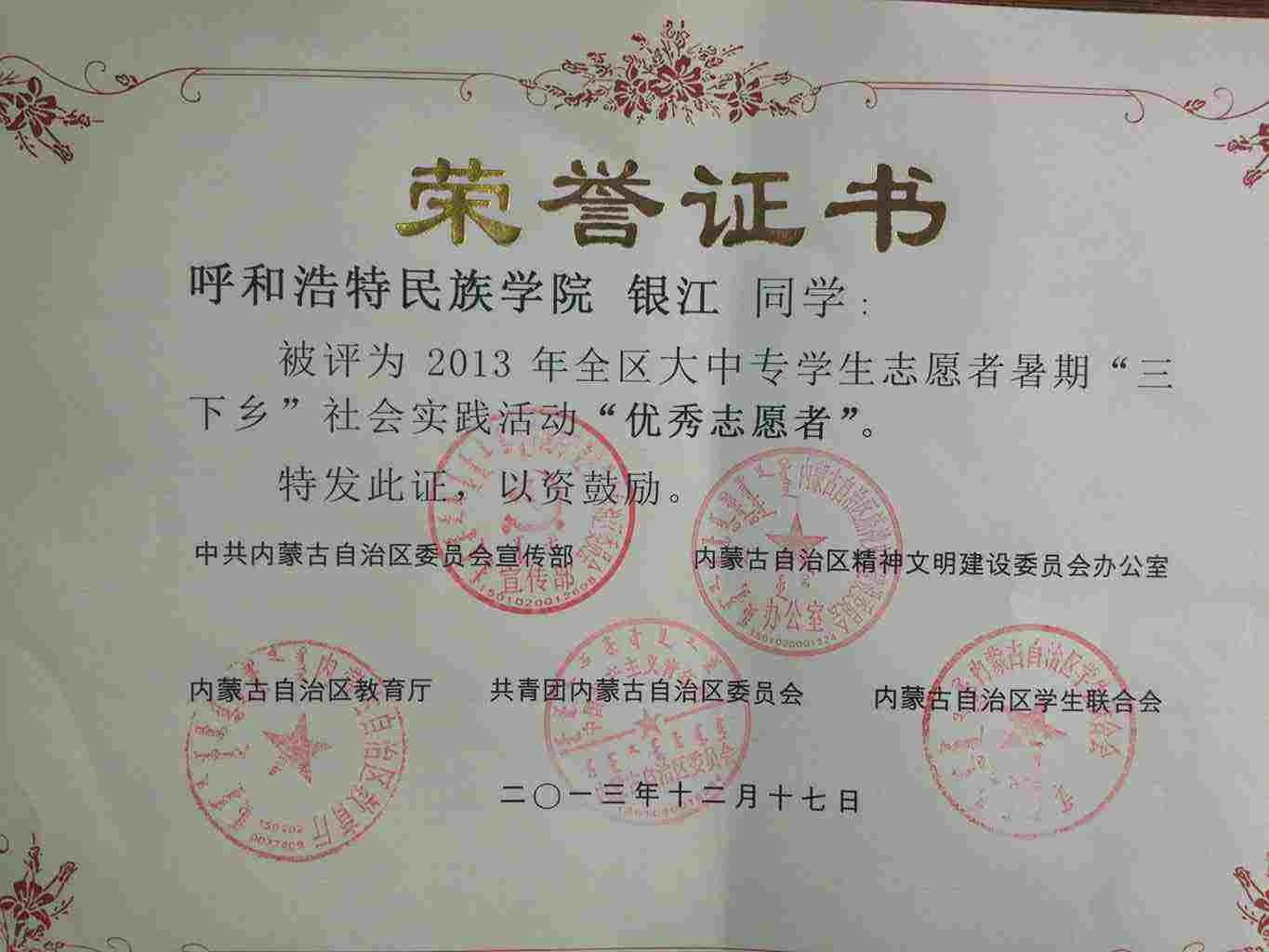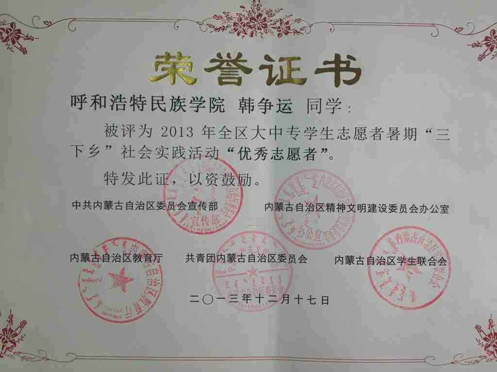 我系2010级日1班学生韩争运,2010级日2班学生银江在2013年度自治区“三下乡”表彰评选活动中荣誉了自治区级“优秀志愿者”荣誉称号。