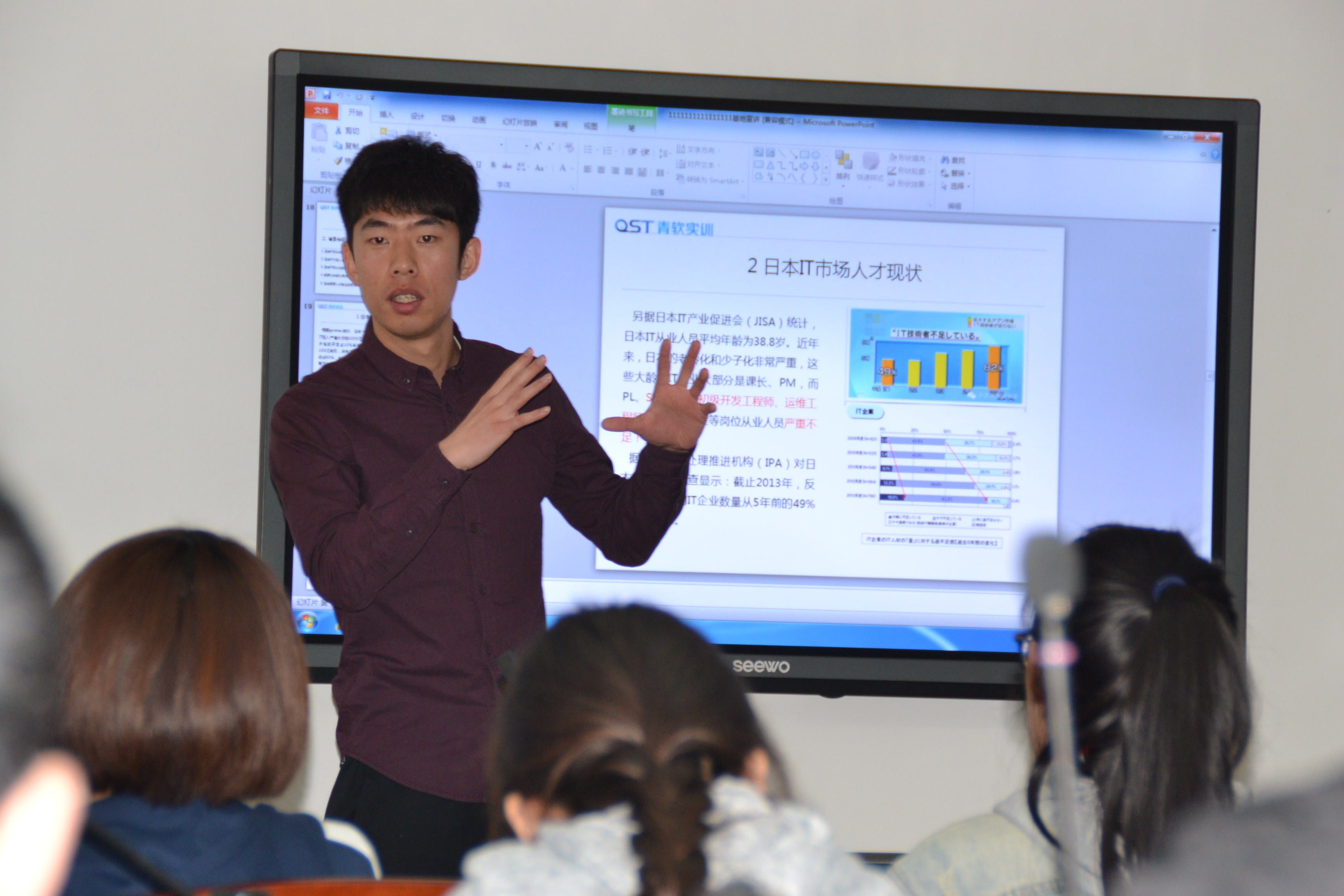 企业代表郭兴作了重点发言,对企业基本情况、校企合作办学历史、实习实训流程、就业前景等作了详细介绍,并认真耐心地解答了学生们提出的各类问题。肖查娜主任总结发言,她强调了申报校企合作专业过程中的不易,表达出全系上下投身应用型外语专业人才培养改革的决心。她还鼓励学生要树立自信,珍惜大学时光,明确专业学习目标,既要学好日语,也要学好IT知识,为实现自己的人生价值奋斗不息。