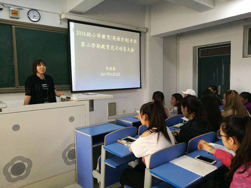 动员会上,高乌兰老师宣读了《外语系2016级小学教育(英语方向)专业第二学期教育见习方案》,并公布了实习指导教师安排及见习生分组情况。外语系肖查娜主任做动员发言,她强调本次见习有利于同学们提前介入和体验教师角色,初步接触实际教学环境,了解一名合格教师应具备的基本素养和条件;她希望大家珍惜见习机会,维护校系名誉,认真履行工作职责,对见习单位负责,为将来从事教师行业打下坚实的基础。