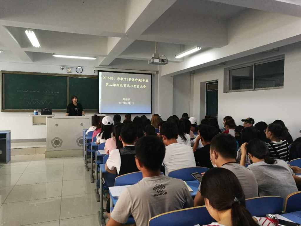 2017年6月2日下午3:20分,外语系在都林楼522教室举行了2016级小学教育(英语方向)专业第二学期教育见习动员大会。会议由外语系教学秘书高乌兰老师主持,见习指导教师和2016级小学教育(英语方向)专业110名学生参加了动员大会。