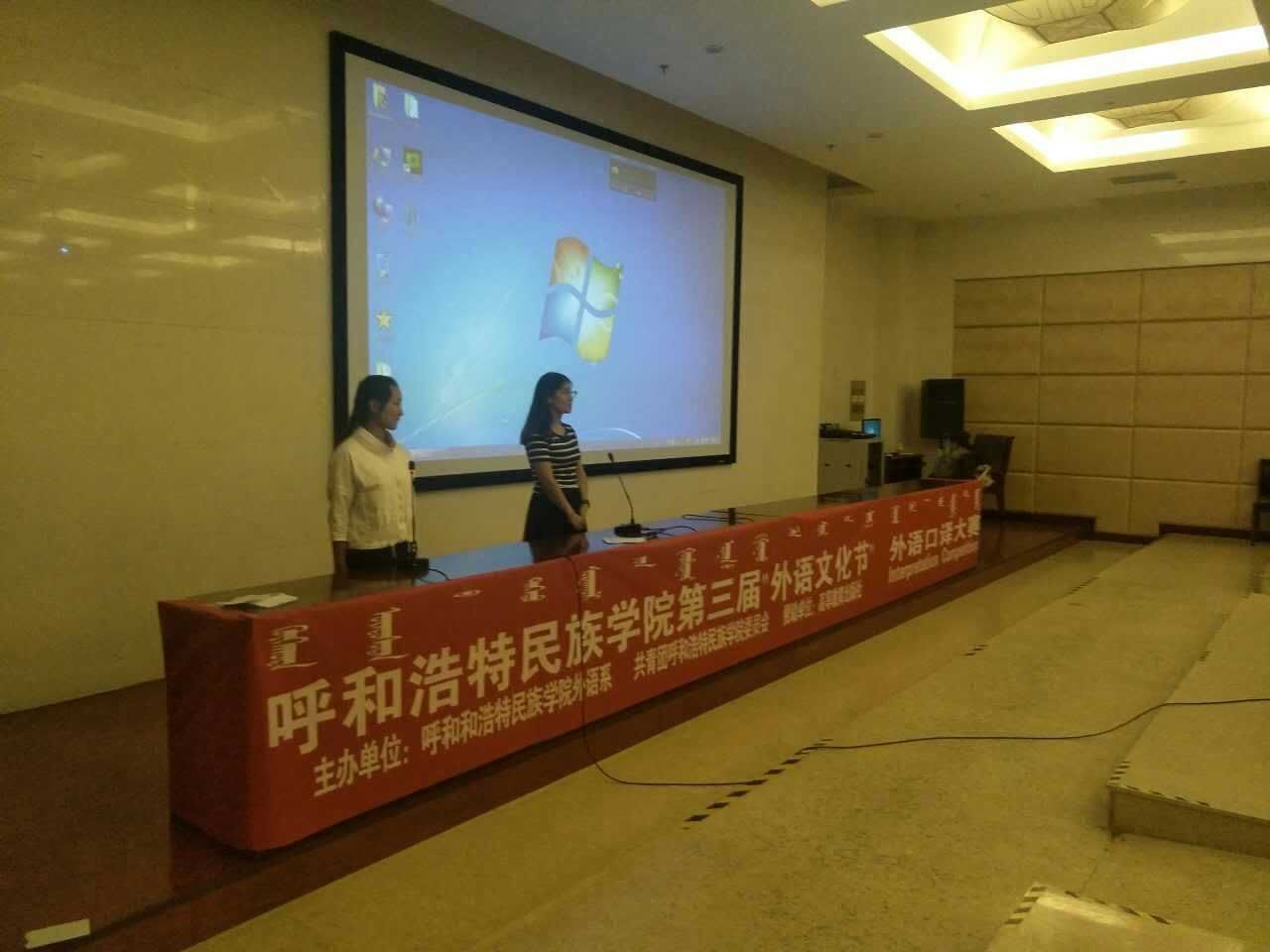 为进一步增强校园学习氛围,丰富和活跃第二课堂活动,检验beat365官网学生运用外语的综合能力,2017年6月22日晚,由高等教育出版社赞助,外语系、校团委主办,公共外语教研室承办的beat365英国官方网站第三届“外语文化节”系列活动之一的外语口译大赛在学校图书馆一楼报告厅拉开帷幕。大赛特邀敖登副教授、陈永清老师、涛歌老师、萨仁其其格老师担任评委,朝木尔勒格老师担任本次大赛的主持人。