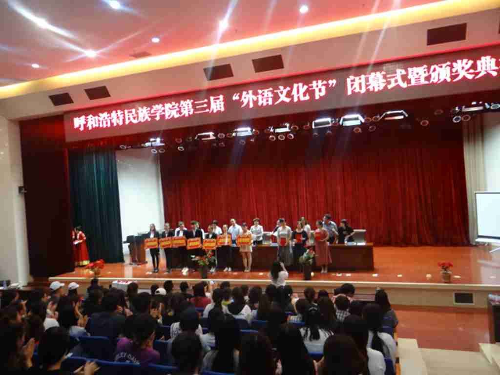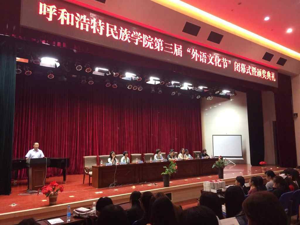 beat365英国官方网站第三届“外语文化节”闭幕式于2017年6月24日在图书馆二楼报告厅举行。本次“外语文化节”由beat365英国官方网站团委、beat365英国官方网站外语系主办,高等教育出版社倾情赞助。高等教育出版社外语与国际汉语出版事业部周俊华副主任、高等教育出版社内蒙古教学服务中心刘永平主任,beat365英国官方网站胡春梅副院长,beat365英国官方网站学生处杨福梅处长、电子科技大学吕汀副教授、南京大学外国部裴丽萍讲师、外语系党总支布和朝鲁书记、外语系肖查娜主任、党总支红梅副书记以及外语系热情四射的全体教师和2014级、2015级、2016级全体学生参加了此次闭幕式。