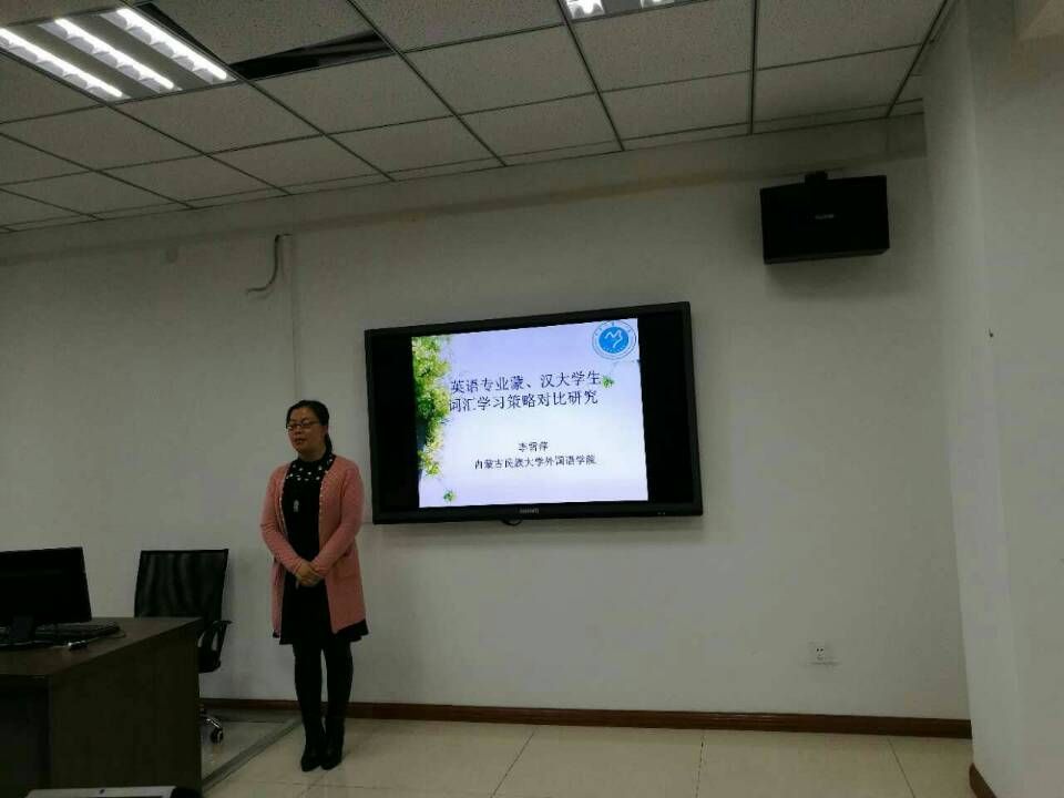 李雪萍老师的讲座以《英语专业蒙、汉大学生词汇学习策略对比研究》为题。王雪萍老师是内蒙古民族大学外国语学院副教授,高年级英语教研室副主任。她以英语专业蒙、汉大学生词汇学习对比研究为基础,利用实证研究和数据统计,分析对比了蒙汉大学生在英语学习中词汇策略使用的异同和在英语课堂教学中的具体运用情况,对授课对象以蒙古语授课大学生为主的我系教师而言,非常值得学习和借鉴。