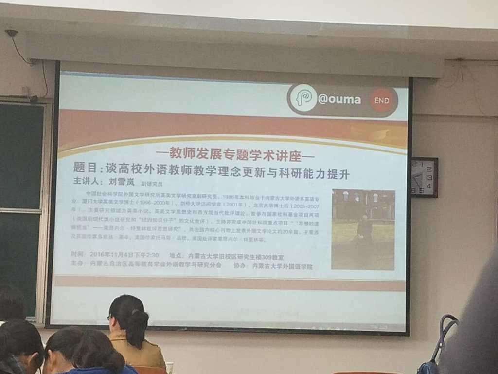 2016年11月4日下午2:30,外语系派出11名英语专业教师前往内蒙古大学听取中国社会科学院外国文学研究所英美文学研究室刘雪岚副研究员所做的题为《谈高校外语教师教学理念更新与科研能力提升》的讲座。讲座在内蒙古大学北校区研究生楼309教室进行。