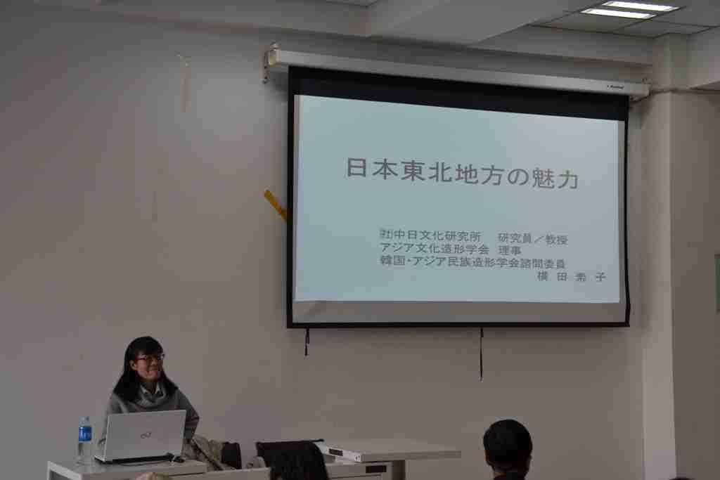 横田素子教授以《日本东北地区的魅力》为题,从饮食文化、民俗文化等方面入手,对日本东北部地区的社会文化生活进行了生动而有趣的介绍。横田素子教授不仅精心搜集了大量的文献资料,还展示出大量鲜活生动的图片,使师生们非常直观地感受到浓郁的日本文化气息。讲座主题新颖、趣味性强,现场气氛热烈,师生们或赞叹,或惊讶,兴奋与激动溢于言表。在谈到日本东北部地区民谣的曲调与蒙古族民歌相似时, 2012级日语1班的宝音呼同学为大家现场演唱了蒙古族民歌《采露水的姑娘》,将讲座气氛推向高潮。讲座结束后,横田素子教授与日语专业师生进行了深入交流 ,对师生提出的问题做出详尽的解答。
