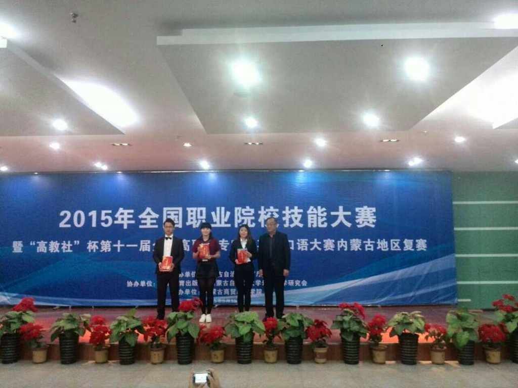 2015年5月15日,全国职业院校技能大赛暨“高教社”杯第十一届全国高职高专实用英语口语大赛内蒙古赛区复赛于内蒙古商贸职业学院拉开帷幕。来自全区21所高校的77名选手参加了比赛。我院外语系派出2013级英语教育专业的王越、牛茹、白苏敏三位同学参加了专业组的比赛。经过一天紧张激烈的角逐,在王牧兰老师的精心指导下,王越同学不负众望,以其标准的发音、流利的表达、敏捷的思维、出色的临场发挥赢得观众阵阵热烈的掌声,最终夺得专业组第一名的好成绩。2015年6月,他将与获得非专业组第一名的同学一起代表内蒙古自治区赴安徽省合肥市参加全国总决赛。