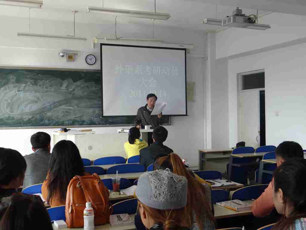 《beat365英国官方网站关于鼓励学生考研有关事宜的通知》出台后,外语系苏日嘎拉图副主任分两批次组织召开了考研动员会。2014年10月14日召开了2015届本科毕业生考研动员会,10月22日下午召开了2012、2013级本科生考研动员会。动员会上苏主任传达了《通知》精神,就学院支持考研的鼓励、优惠和奖励措施进行了详细的解读,并结合学生专业特点,进行了专业方向选择、考研学习方式方法的指导。