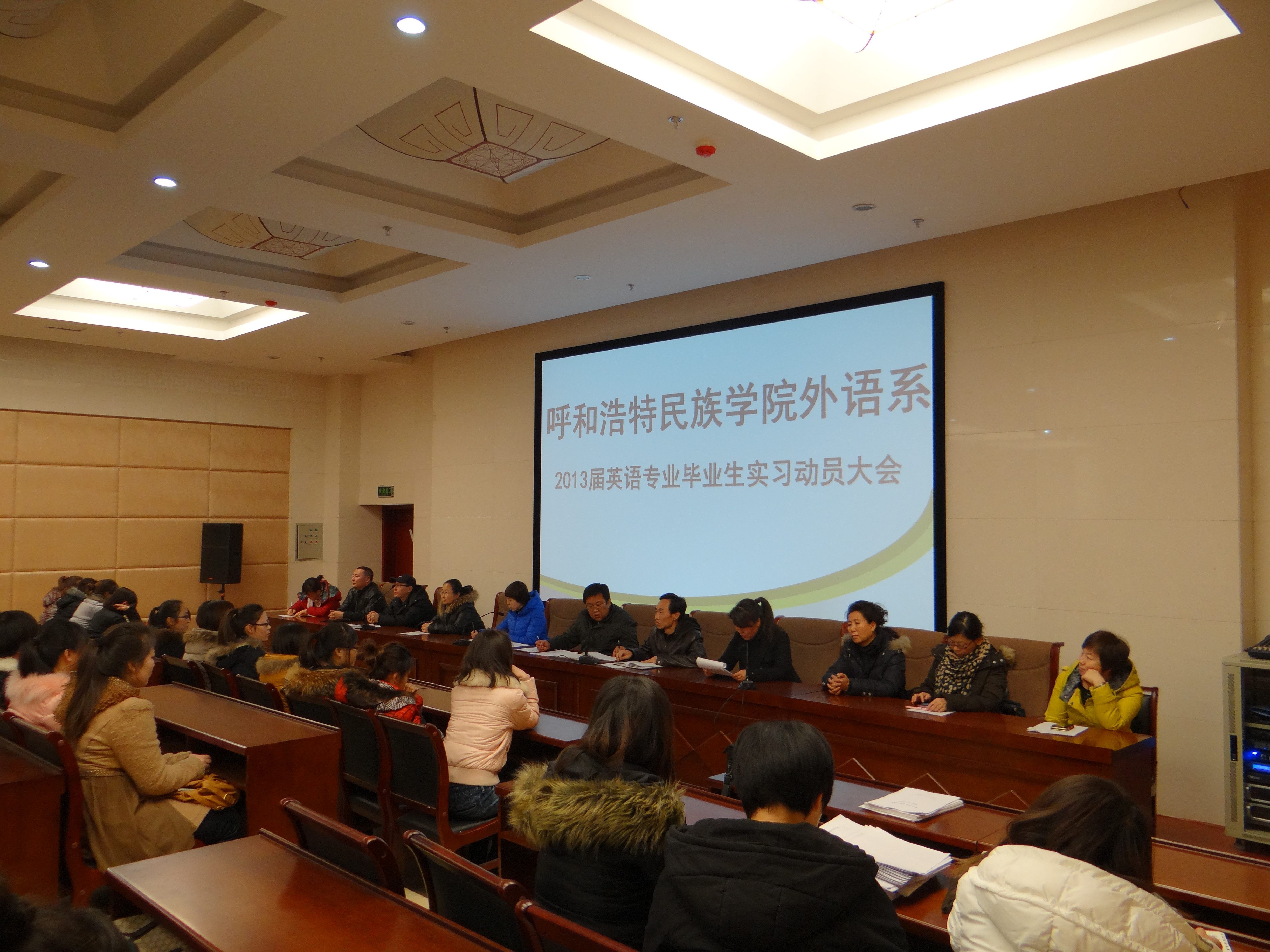 大会由外语系苏日嘎拉图副主任主持,系党总支布和朝鲁书记宣布2013届应用英语1、2班,2013届英语教育1、2班实习生分组、实习指导教师安排情况。英语教研室副主任乌云斯日古楞宣读2013届英语专业毕业生实习方案。胡日查老师代表实习指导教师发言。赵馨娜同学代表全体实习生发言。最后,外语系肖查娜主任对实习生提出具体的要求和希望。