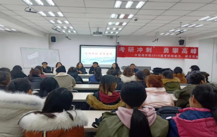 考研冲刺,勇攀高峰。为舒缓考研学子备考压力,帮助我院考研学生以坦然的心态和坚定的信心迎接考试,11月29日下午,外国语学院在都林楼626室组织开展了2016级考研学生助力、减压活动。学院党总支书记布日古德、院长肖查娜、党总支副书记红梅和2016级班主任代表、任课教师代表参与本次活动,为即将考研的45名同学送上了鼓励和祝福。