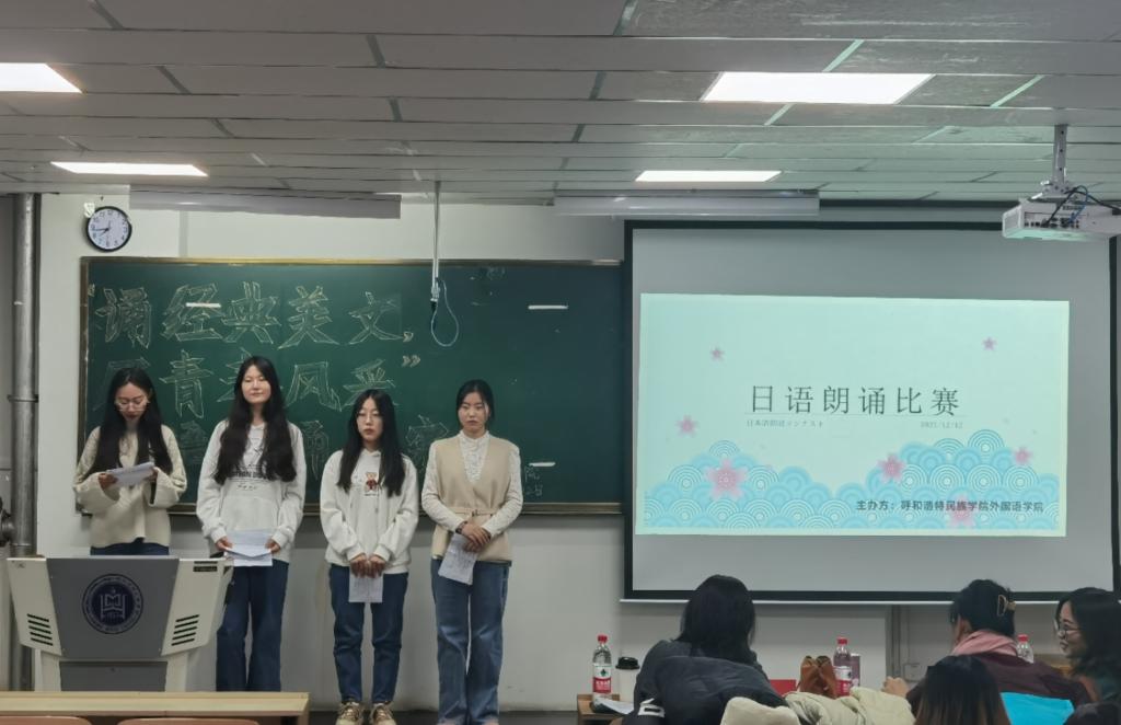 为锻炼同学们的口语表达能力、自我表现能力,展现大学生的专业风采,营造良好的日语学习氛围12127外国语学院于尚智楼314教室举办“诵经典美文,展青春风采”日语朗诵比赛。日语教研室何桂花老师、包金兰老师、高乌兰老师、白红梅老师担任本次比赛评委,参赛选手为在校日语专业学生。