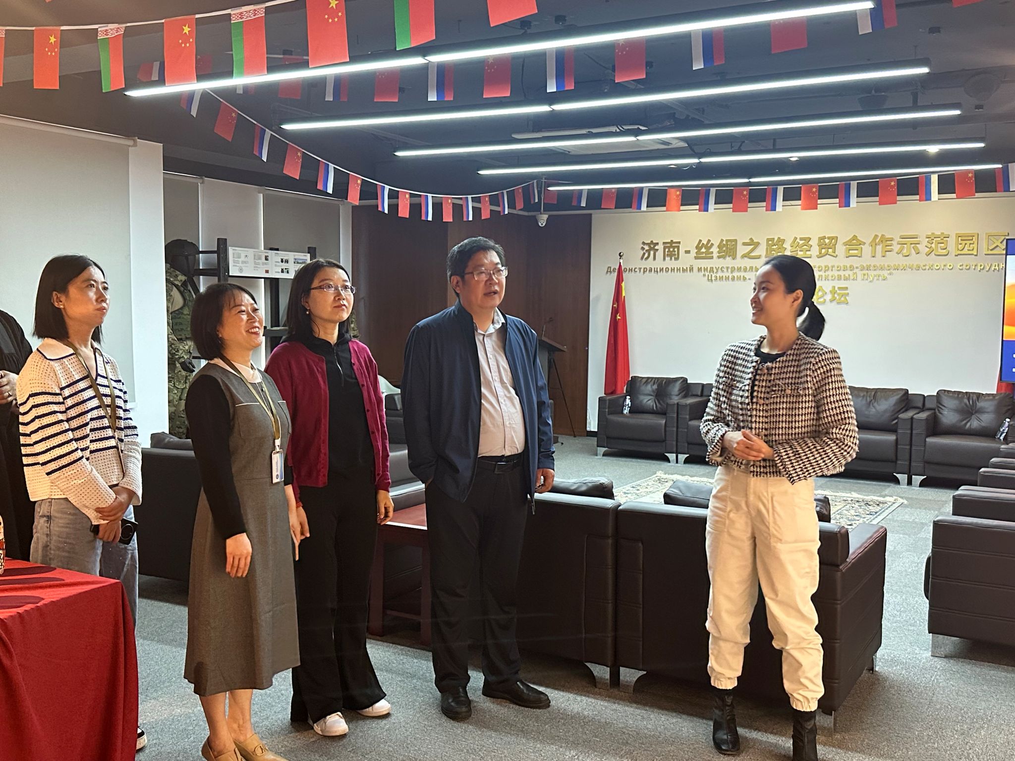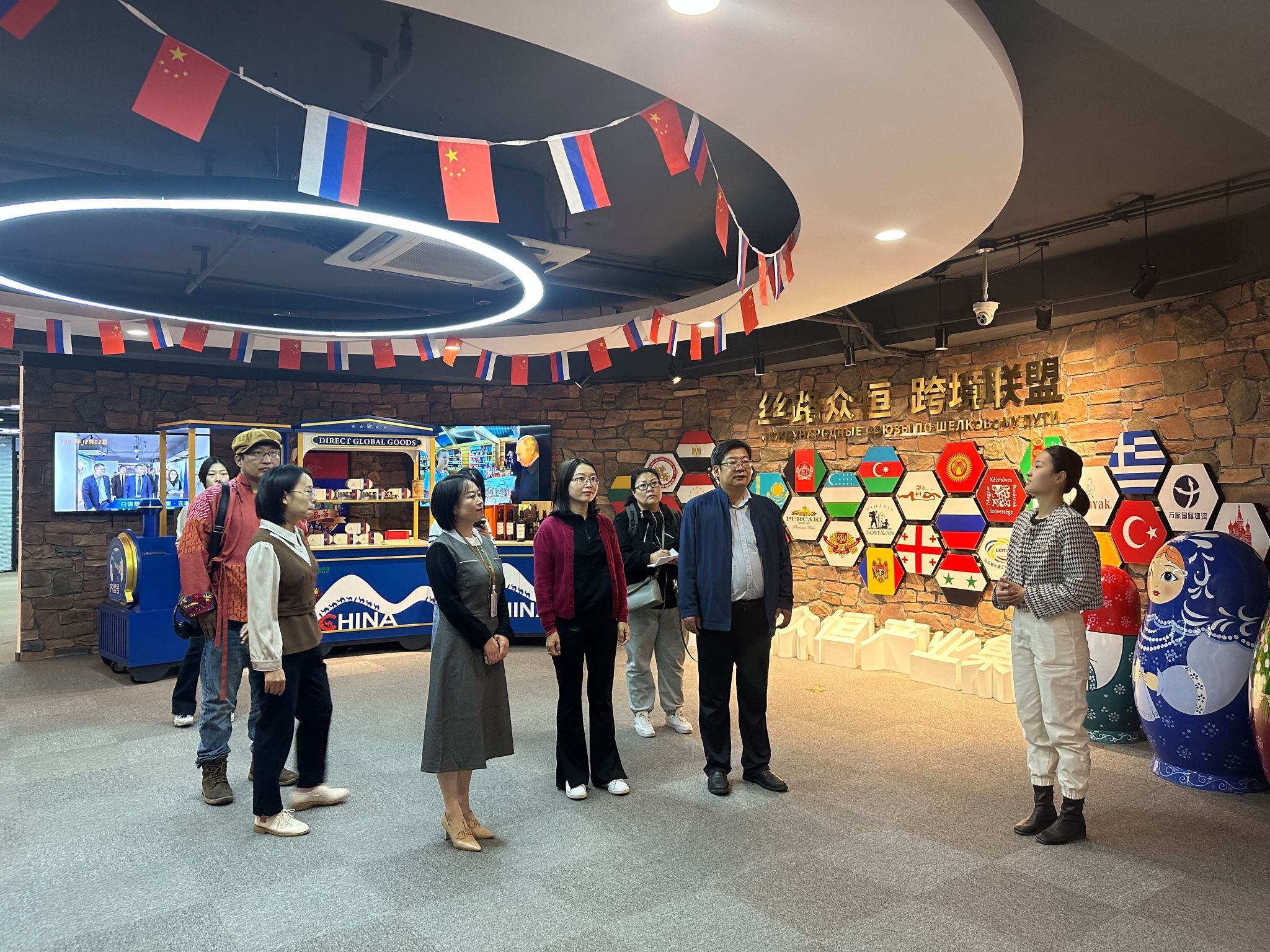 调研组一行首先参观了国贸电商产业园“一带一路”特色展览馆。这一展览馆是由济南国商园区运营管理有限公司在国家大力推进“一带一路”建设的历史背景下建立的,也是济南市唯一以“丝绸之路”为主题的“跨境贸易展览馆”。展品涵盖了来自16个国家的260余种产品,生动展示了济南与“一带一路”沿线国家之间的经贸合作和文化交流。该展览馆已成为济南与“一带一路”国家交往的重要窗口。