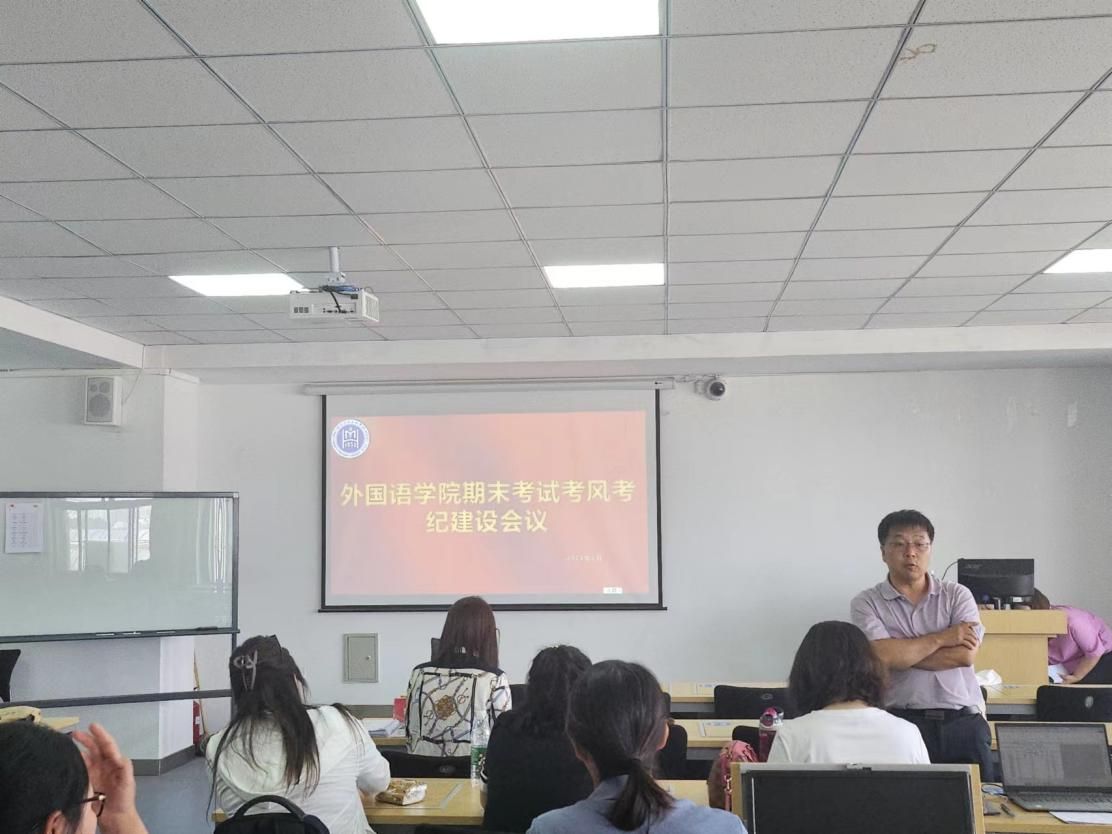 6月14日,外国语学院召开了期末考试考风考纪建设会议,外国语学院副院长秦红喜、副院长红鸽以及全体教职工参与了此次会议。