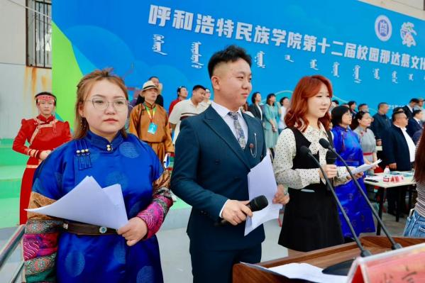 跨文化交际教学实践活动共分为两个部分,第一部分是开幕式环节的英文主持任务,2023级王笑傲雪同学以流利清晰的英语口语和得体的仪态,她与其他两位主持人默契配合,完成校园那达慕大会开幕式入场队伍介绍的英文主持任务。教学实践的第二部分由2023级翻译班全体同学以英语记者团身份深入活动现场,学生小组分别对搏克、射箭、布鲁、喜塔尔、沙嘎等那达慕传统项目展开多维度拍摄、采访与报道,用英文介绍各项比赛的历史、比赛规则和对现场选手的英文采访等,同学们用镜头与语言记录并传递校园那达慕大会上的北疆体育文化特色,同时感受到这些体育项目背后所共有的中华文化精神内涵。