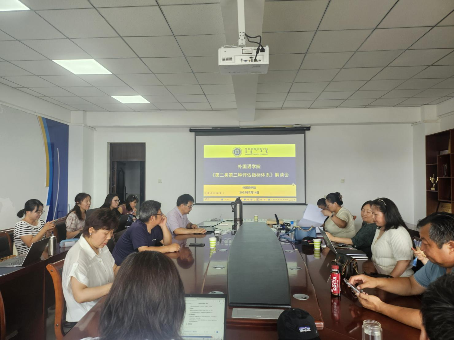 为深入贯彻落实学校本科教育教学审核评估工作部署,确保高质量完成迎评任务,7月14日,外国语学院召开《第二类第三种评估指标体系》专题解读暨工作推进会。学院党总支书记朱俊杰、院长秦红喜、党总支副书记红梅及全体教职工参加会议,会议由秦红喜主持。