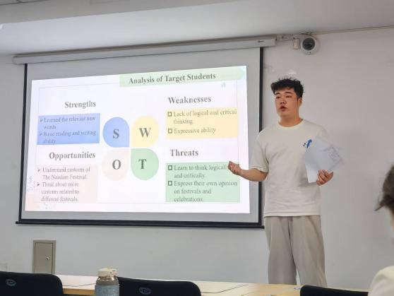 决赛现场,选手们各展所长,呈现了多堂精彩的模拟课堂。有的以趣味动画导入语法教学,将抽象知识点具象化;有的通过小组合作任务设计,打造沉浸式语言实践场景;还有的结合跨文化案例,拓宽课堂知识边界,充分体现了“以学生为中心”的现代教学理念。在答辩环节,选手们面对评委关于“课堂突发情况处理”“差异化教学实施”等问题,从容应对、逻辑清晰,展现了良好的教学应变能力与反思意识。
