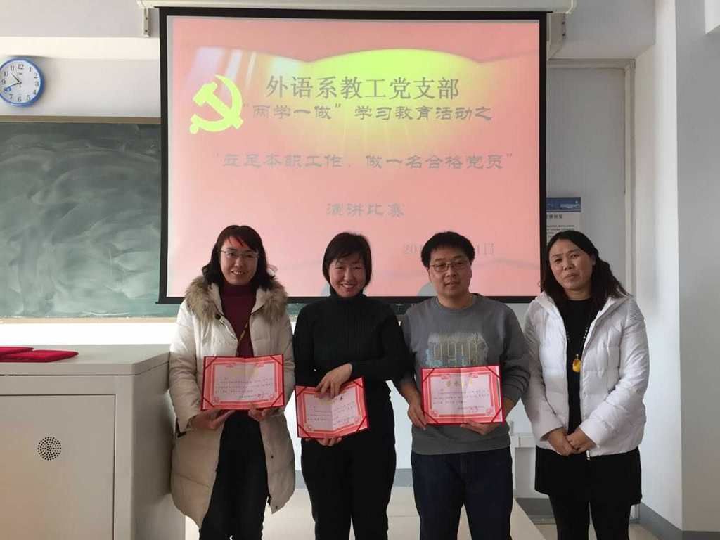 1月11日上午,外语系教工党支部举办 “立足本职工作,做一名合格党员”主题演讲比赛。外语系14位年轻党员参加比赛。