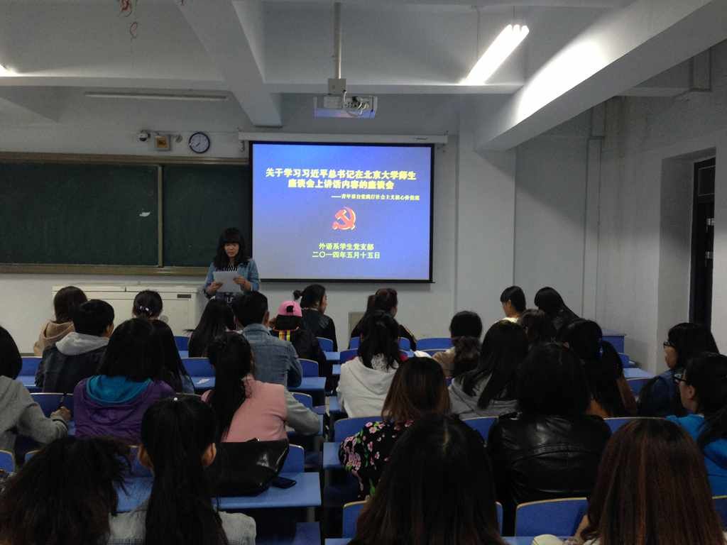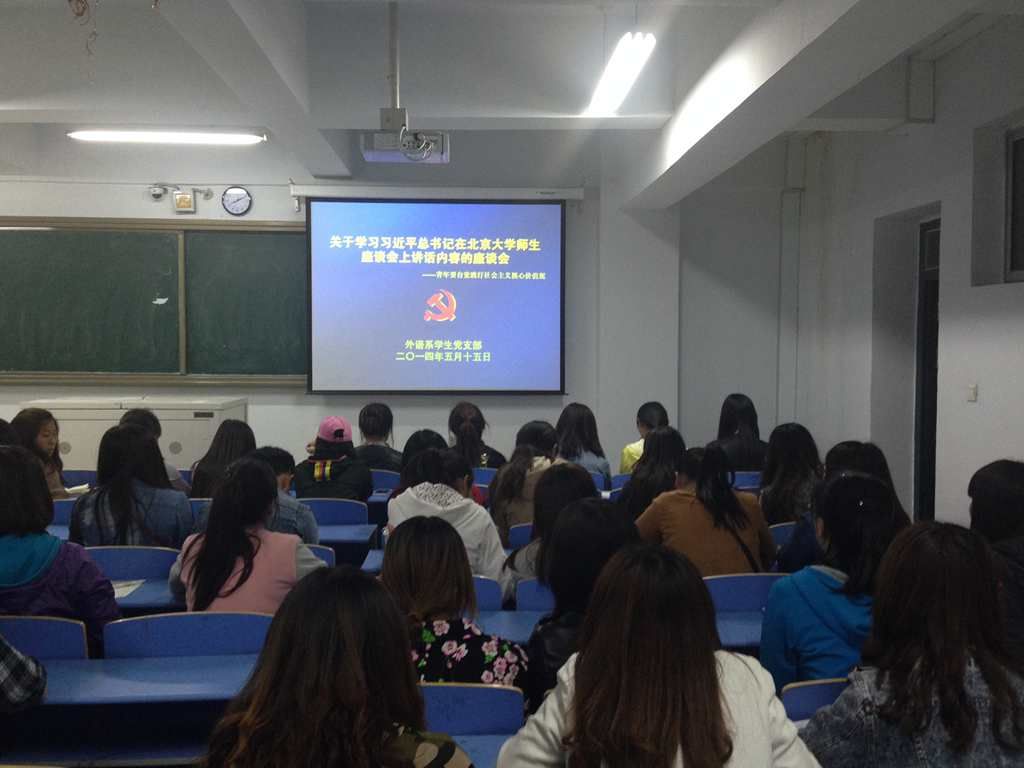 2014年5月15日晚,外语系团总支、学生党支部组织40名学生党员及团学干部,在618教室学习了习近平总书记在北京大学师生座谈会上的讲话精神。