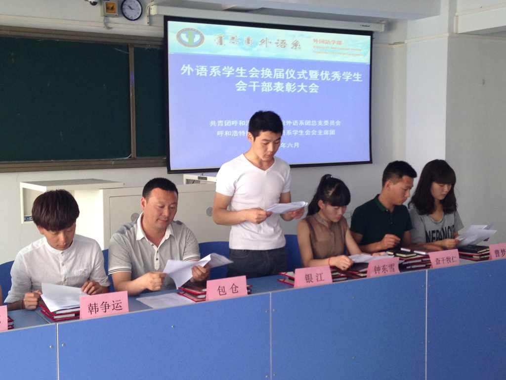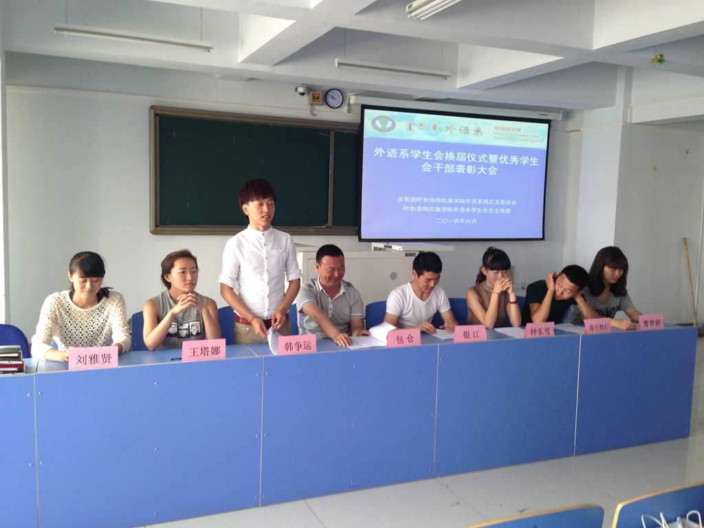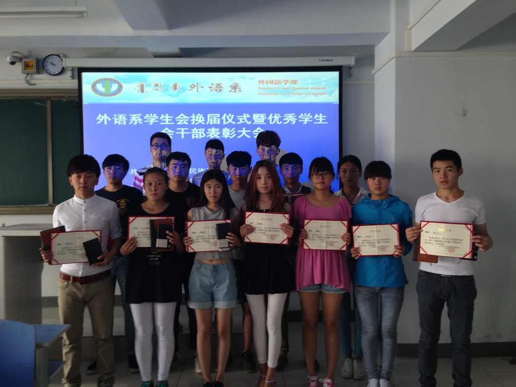2014年6月3日中午,外语系召开学生会换届暨优秀学生会干部表彰大会。团总支书记包仓、第二届学生会主要学生干部、第三届学生会全体成员和各班级班长、团支部书记近60人参加了会议。会议由团总支委员曹梦婷主持。