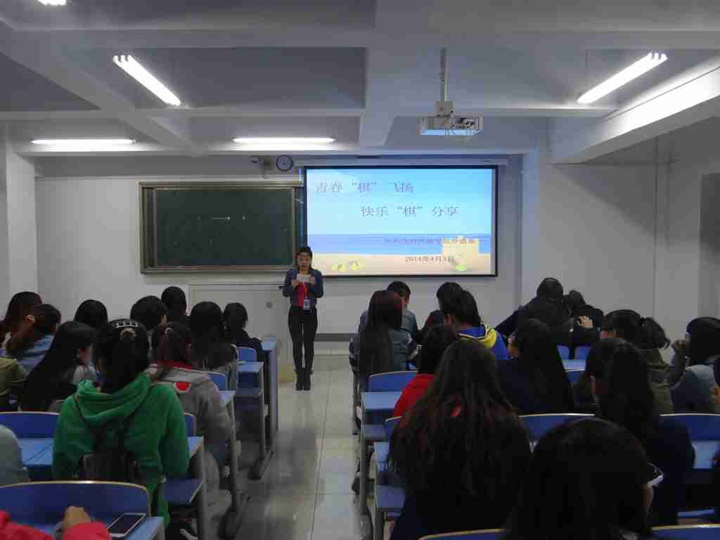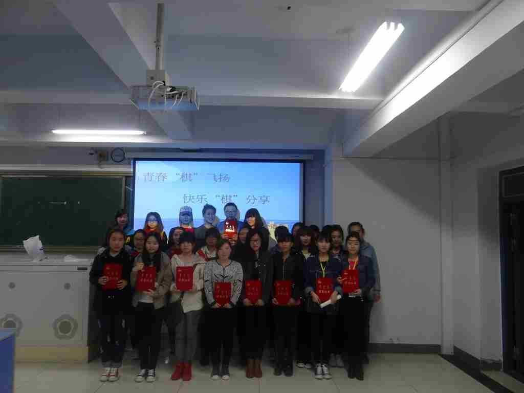 为丰富同学们的课外娱乐生活,弘扬中华民族传统文化,培养同学们健康的爱好,锻炼同学们的思维能力,2014年4月3日晚7:30,外语系团总支在新教学楼618教室举办了“青春棋飞扬,快乐棋分享”大学生棋类比赛,近200名选手参加本次比赛,经过紧张激烈的5轮赛事,最终评选出五子棋和跳棋比赛的一、二、三等奖以及优秀奖。具体获奖名单公布如下: