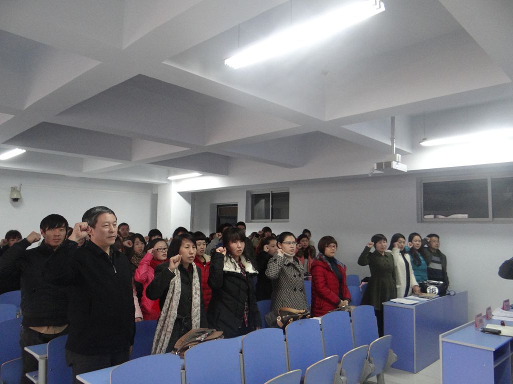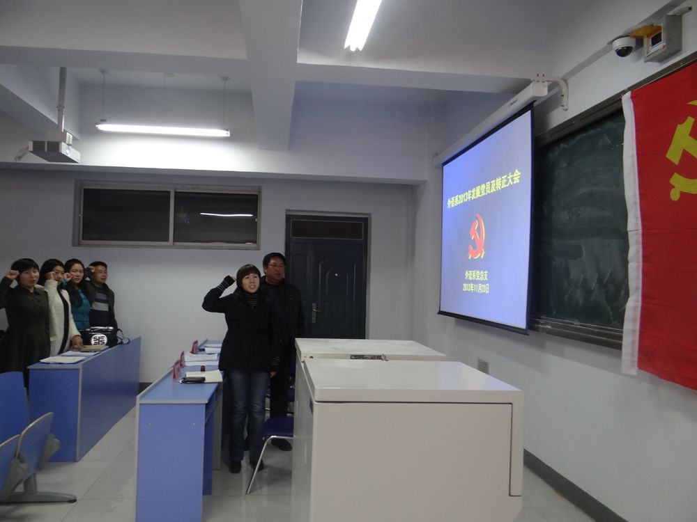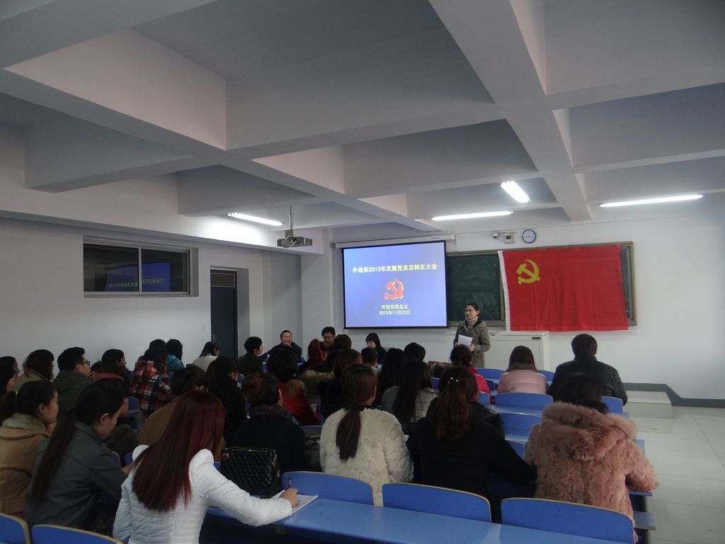 为推进党的群众路线教育实践活动,2013年11月23日下午3:30-4:30,外语系党总支在新教学楼602教室召开了外语系下半年发展党员、转正党员大会和新党员入党宣誓仪式。