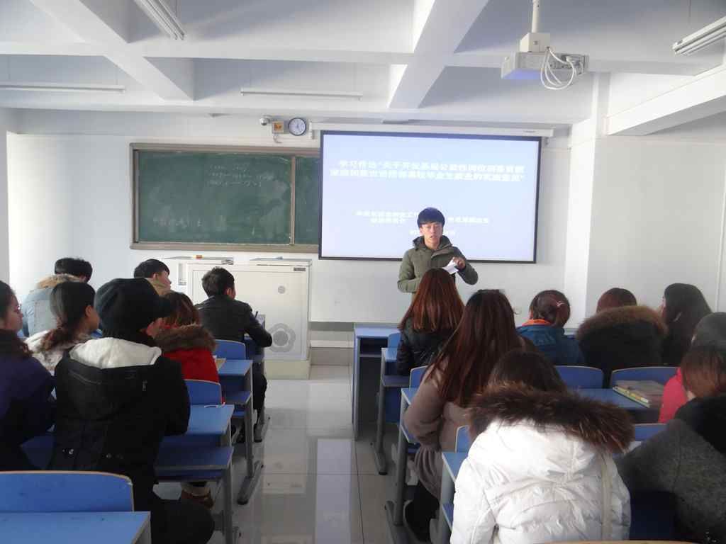 2013年12月4日中午12点10分,外语系就业创业工作指导委员会在新教学楼618教室组织全系蒙语授课班主要学生干部,举办了“政策下基层,关爱大家庭”主题宣传活动,重点传达学习了由内蒙古自治区人力资源和社会保障厅及内蒙古自治区财政厅下发的《开发基层公益性岗位招募贫困家庭和蒙古语授课高校毕业生就业的实施意见》,并发放了宣传材料,并进行了广泛宣传动员工作。