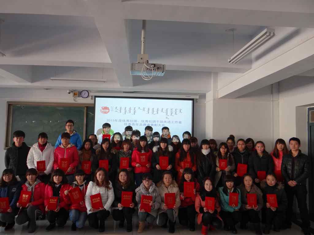 为表彰先进,引导和激励广大学生社团及社团工作者立足新起点,实现新发展,2013年12月13日中午,外语系团总支、学生会在新教学楼618教室组织召开了优秀社团等系列表彰大会,授予了青年志愿者服务大队等3个社团为“优秀社团”,授予银江等10位同学为“优秀社团干部”,曹梦婷等20位同学为“先进工作者”,刘远志等10位同学为“优秀青年志愿者”荣誉称号。